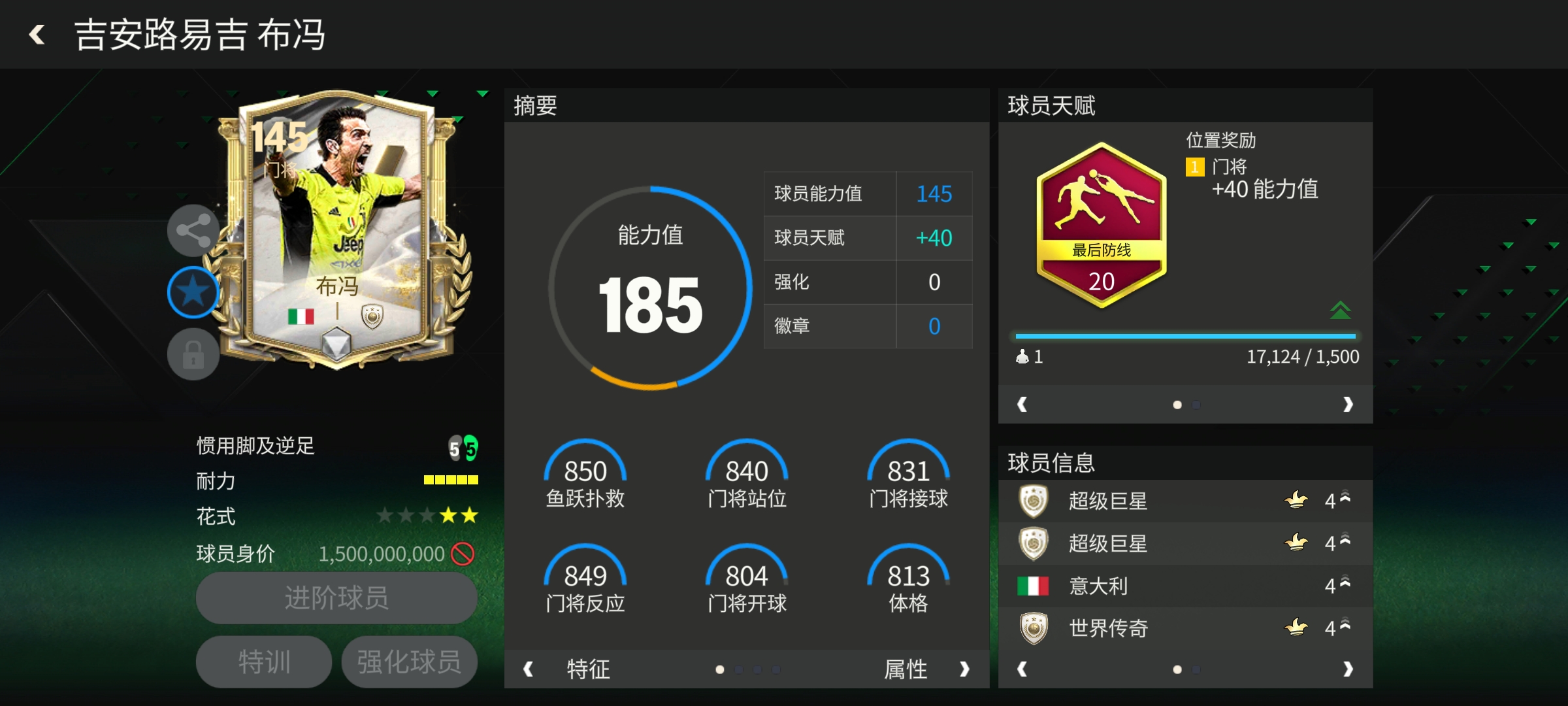 意大利门神布冯出生于1978年,他拥有漫长的职业生涯,为自己的国家队赢得了世界杯冠军。游戏中,辉煌时代布冯配备了门将专属的最后防线天赋,这对他的多项门将关键数据都有提升,让他的扑救表现更加出色。