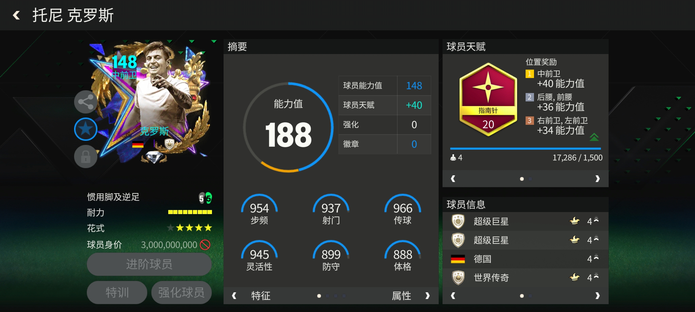 皇家马德里的“典礼三中场”组合成员之一,克罗斯出生于1990年。常青树活动中,他推出的球员卡配备了指南针天赋,对他的盘带、传球等数据都有提升。花式方面,高级油炸丸子搭配四星花式星级,克罗斯是一名可靠的中场持球手。