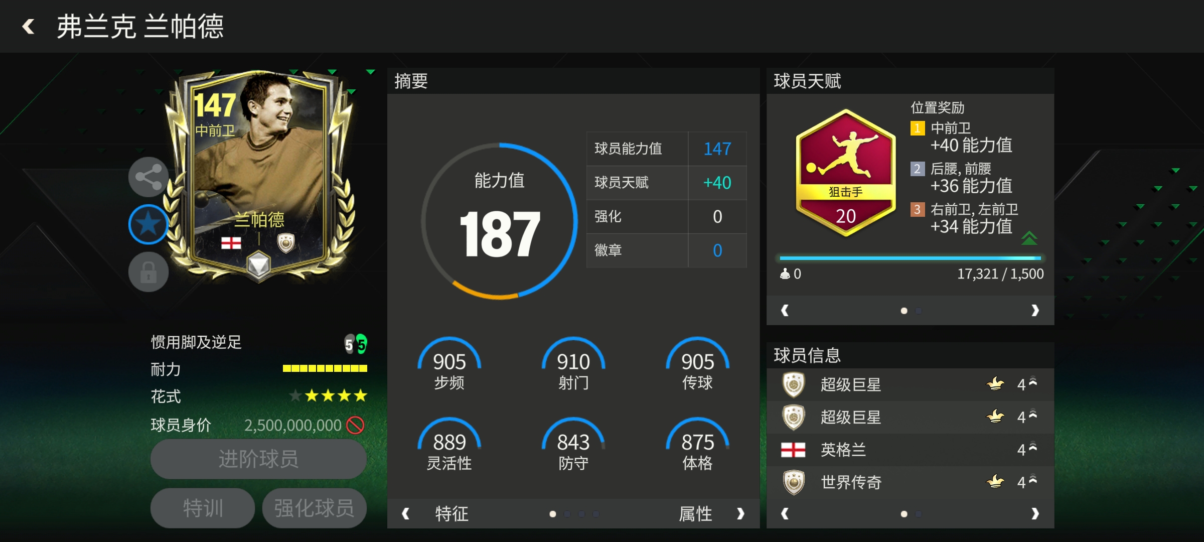 出生于1978年的兰帕德是切尔西队史最伟大的队长,也是英格兰“中场双德”之一。游戏中,雷霆万钧兰帕德配备狙击手天赋,对他的加速、远射等数据都有提升。高达10格的耐力搭配双高攻守效率,这让兰帕德在中场的整体存在感更强。