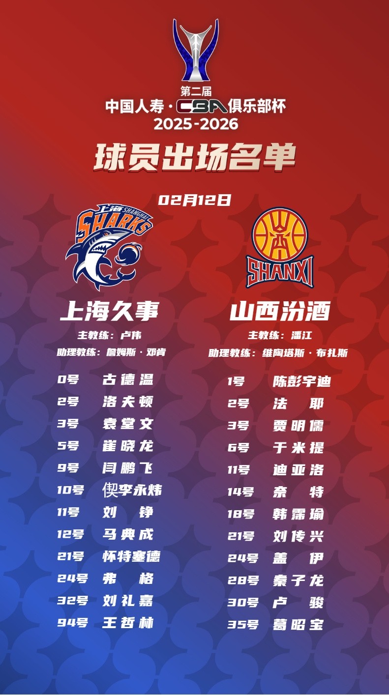 2月12日19:30,第二届CBA俱乐部杯决赛将在内蒙古呼和浩特打响,卫冕冠军上海久事对阵首次闯进全国大赛决赛的山西汾酒,以下是双方出场大名单。