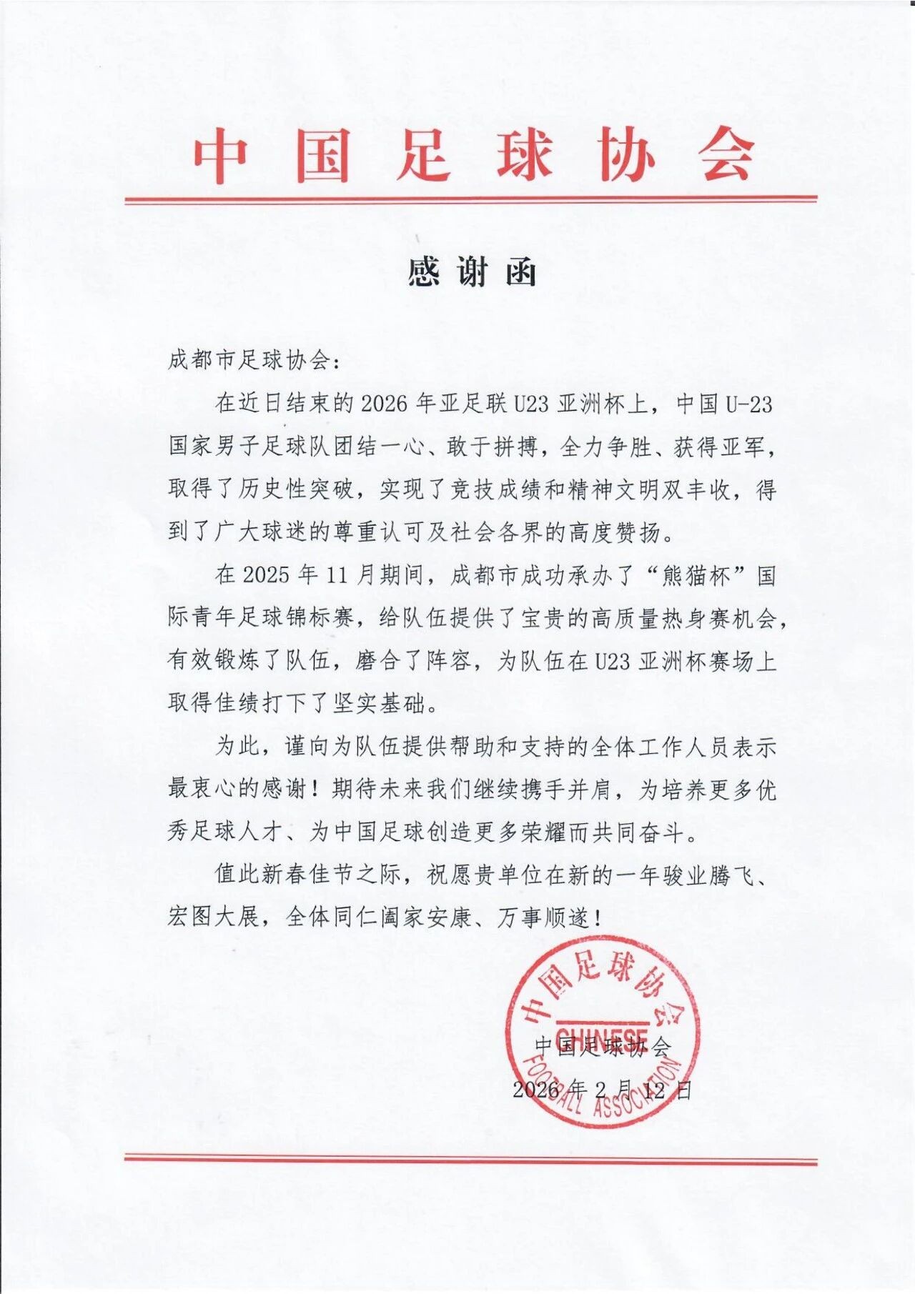 2月12日,成都市足协发布动态表示,新春佳节来临之际,中国足球协会向成都市足球协会发来感谢函,就2025“熊猫杯”期间成都市为U23国家队备战亚洲杯所做出的努力和支持,表示隆重感谢!