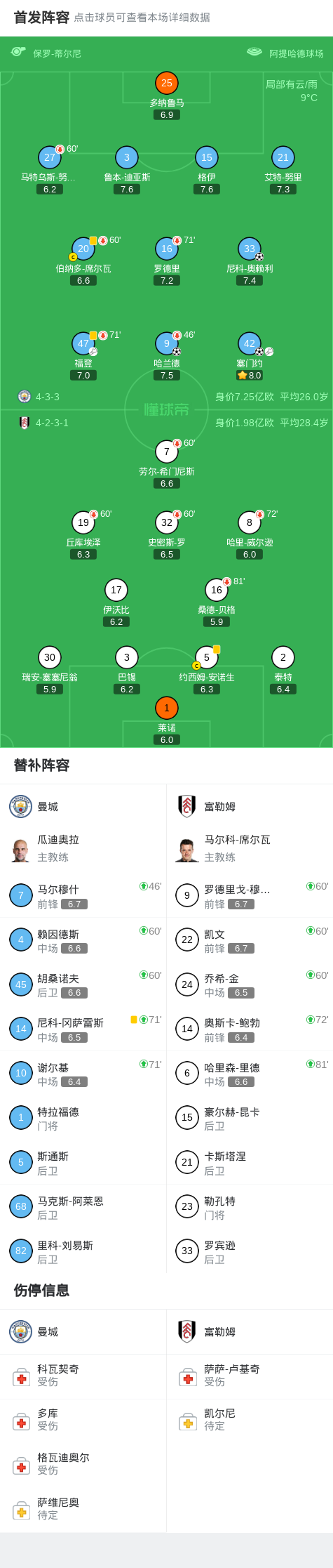 北京时间2月12日英格兰足球顶级联赛 联赛 第26轮,曼城主场对阵富勒姆。曼城塞门约破门,尼科-奥赖利破门,哈兰德破门。最终比分曼城 3–0 富勒姆。