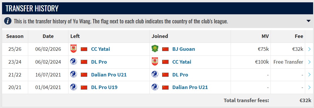 据德转信息显示,王禹今年冬窗从长春亚泰加盟北京国安的转会费为3.2万欧元(约合人民币26万元)。