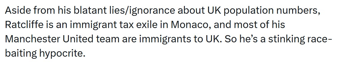 皮尔斯-摩根在社媒写道:除了拉特克利夫对英国人口数据的公然谎言或无知之外,拉特克利夫本人就是一名移居摩纳哥的“税务流亡者”,而且他麾下的大多数曼联球员也都是来到英国效力的“移民”。所以,他这种煽动种族情绪的言论,实在是虚伪至极。