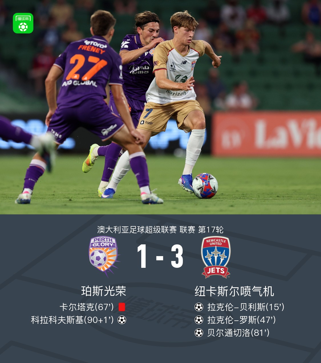 北京时间2月13日澳大利亚足球超级联赛第17轮,珀斯光荣主场对阵纽卡斯尔喷气机。比赛中,贝利斯、罗斯分别破门。之后珀斯光荣卡尔塔克被红牌罚下,比赛尾声,贝尔通切洛破门,科拉科夫斯基扳回一城。最终比分珀斯光荣1-3纽卡斯尔喷气机。