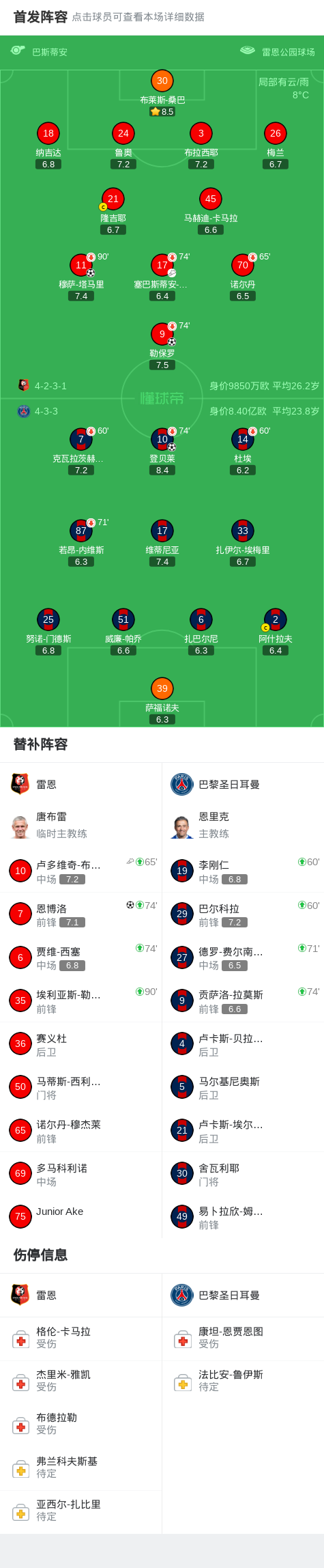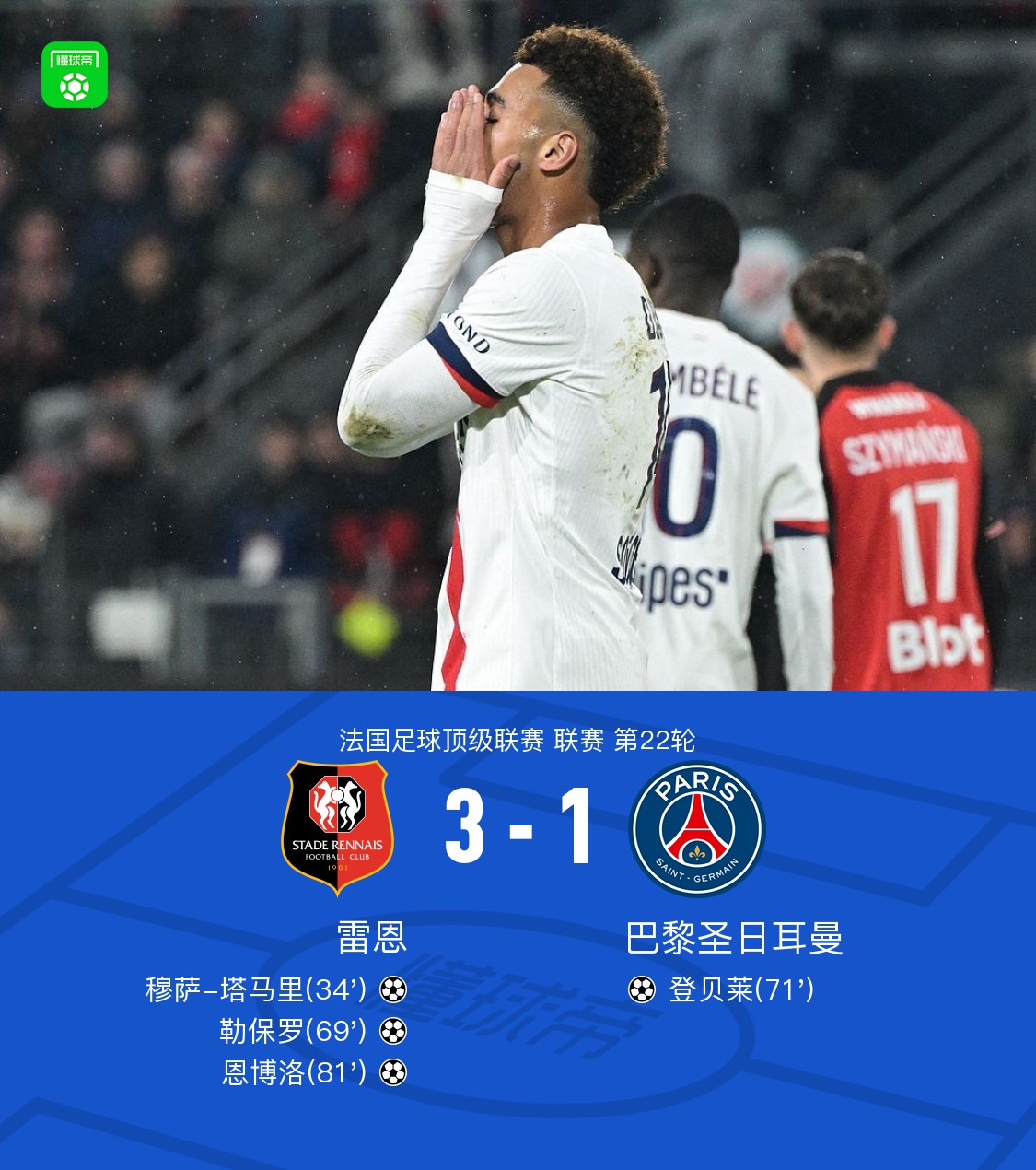 北京时间2月14日法国足球顶级联赛第22轮,雷恩主场对阵巴黎圣日耳曼。比赛中,穆萨-塔马里为雷恩率先破门,随后勒保罗接队友助攻再下一城;巴黎圣日耳曼凭借登贝莱的进球追回一分,但雷恩最后阶段由恩博洛接队友助攻锁定胜局。最终比分雷恩3-1巴黎圣日耳曼。
