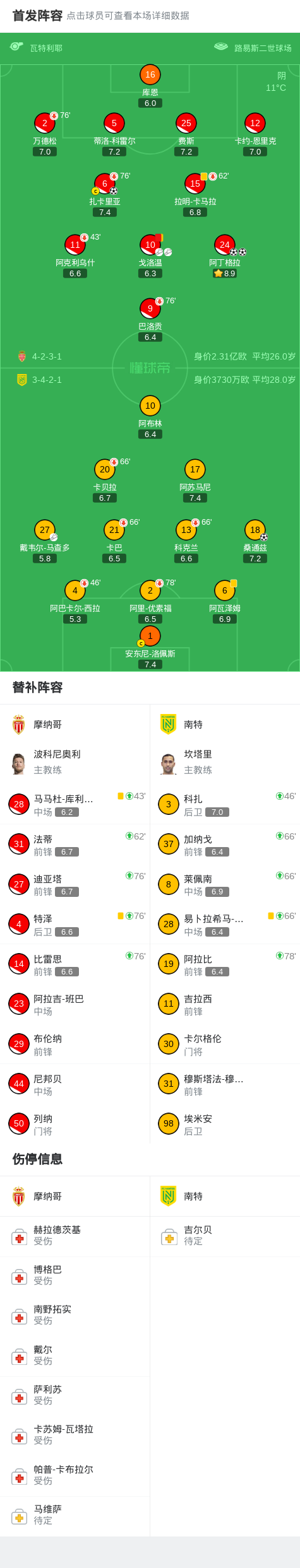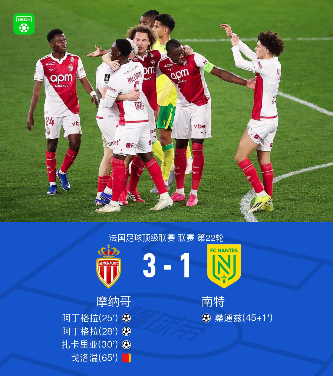 北京时间2月14日法国足球顶级联赛 联赛 第22轮,摩纳哥主场对阵南特。摩纳哥阿丁格拉梅开二度,扎卡里亚破门。南特桑通兹破门。最终比分摩纳哥 3–1 南特。