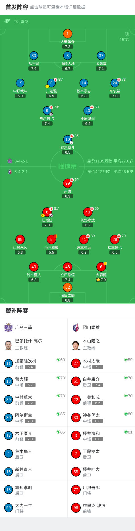 北京时间2月14日日本职业联赛J1西区第2轮,广岛三箭主场对阵冈山绿雉。广岛三箭热尔曼-良破门。冈山绿雉江坂任破门,小仓幸成染红。最终比分广岛三箭点球大战总比分65击败冈山绿雉。