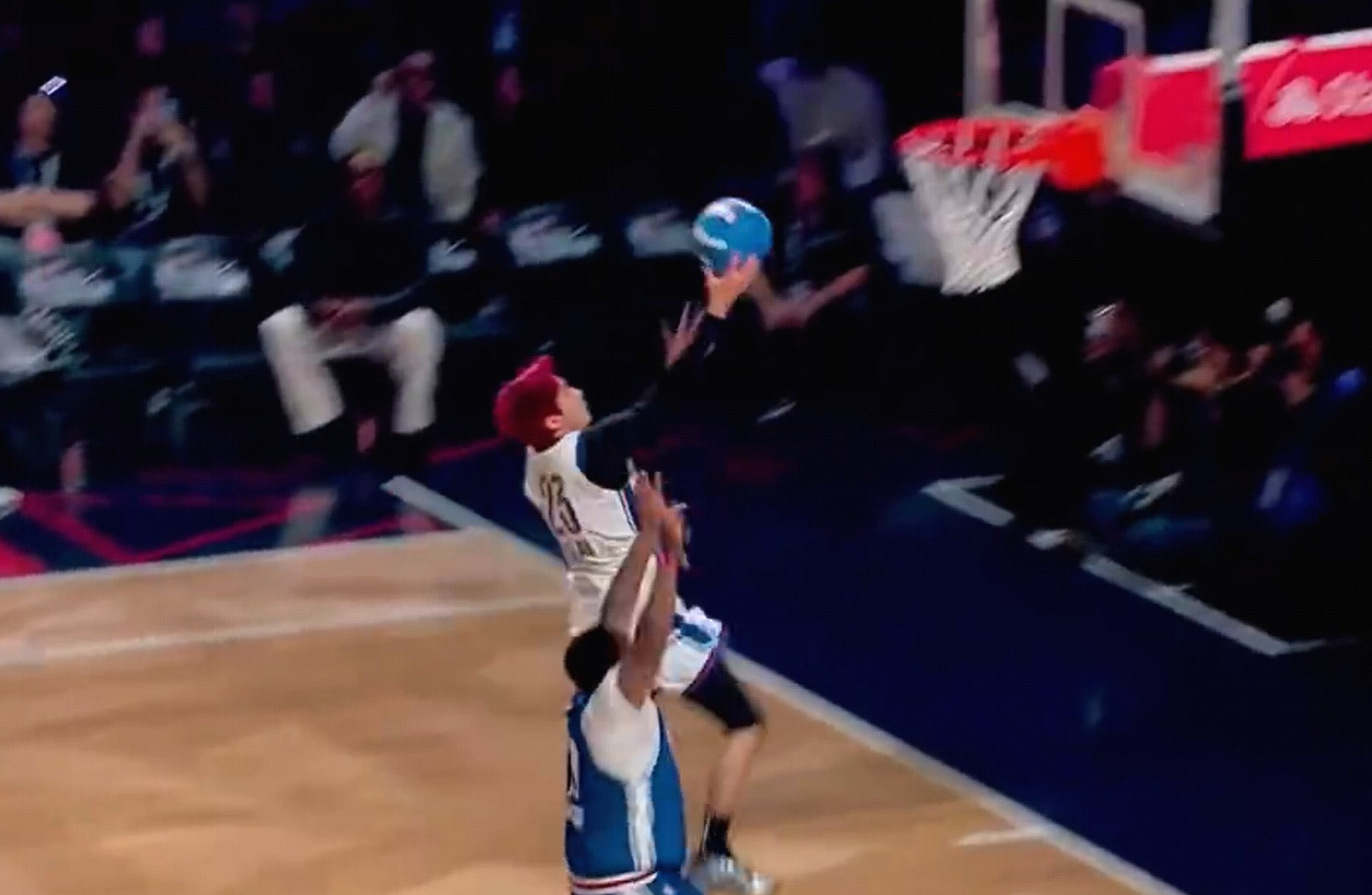 比赛进行到第一节中段时,中国艺人王鹤棣替补登场,在一次进攻中,王鹤棣提前启动下快攻,抢到防守篮板的林书豪心领神会送出长传,王鹤棣接林书豪传球完成上篮。