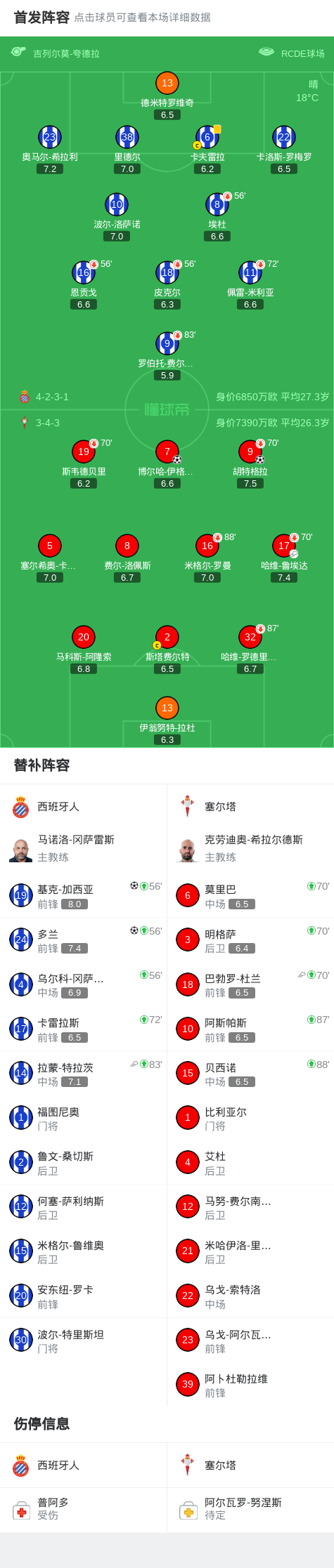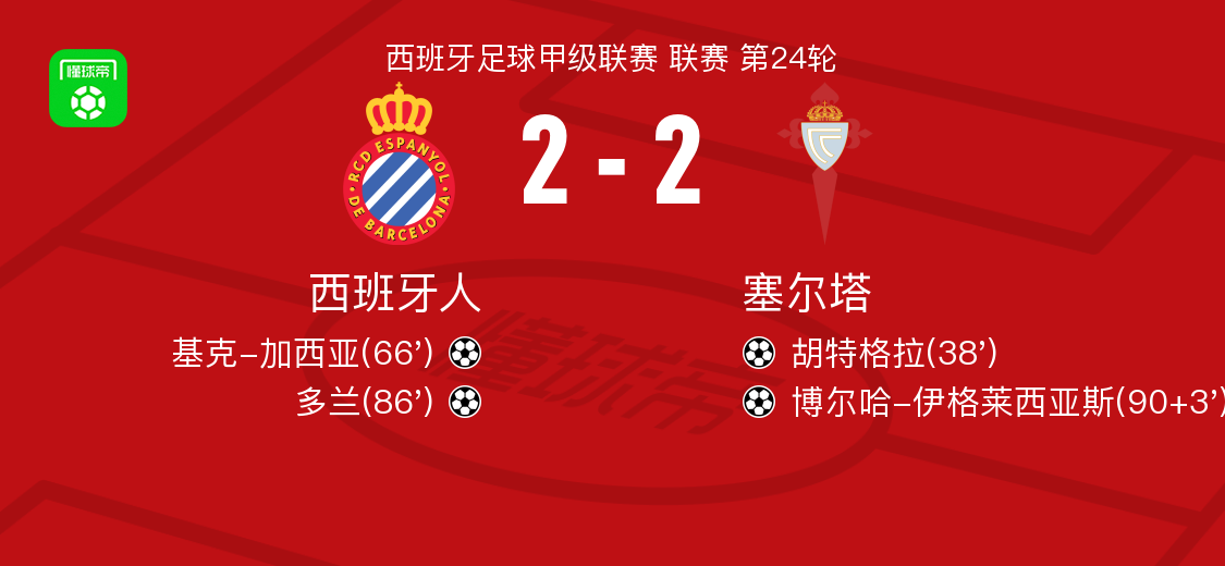 北京时间2月14日西班牙足球甲级联赛 联赛 第24轮,西班牙人主场对阵塞尔塔。西班牙人基克-加西亚破门,多兰破门。塞尔塔胡特格拉破门,博尔哈-伊格莱西亚斯破门。最终比分西班牙人 2–2 塞尔塔。