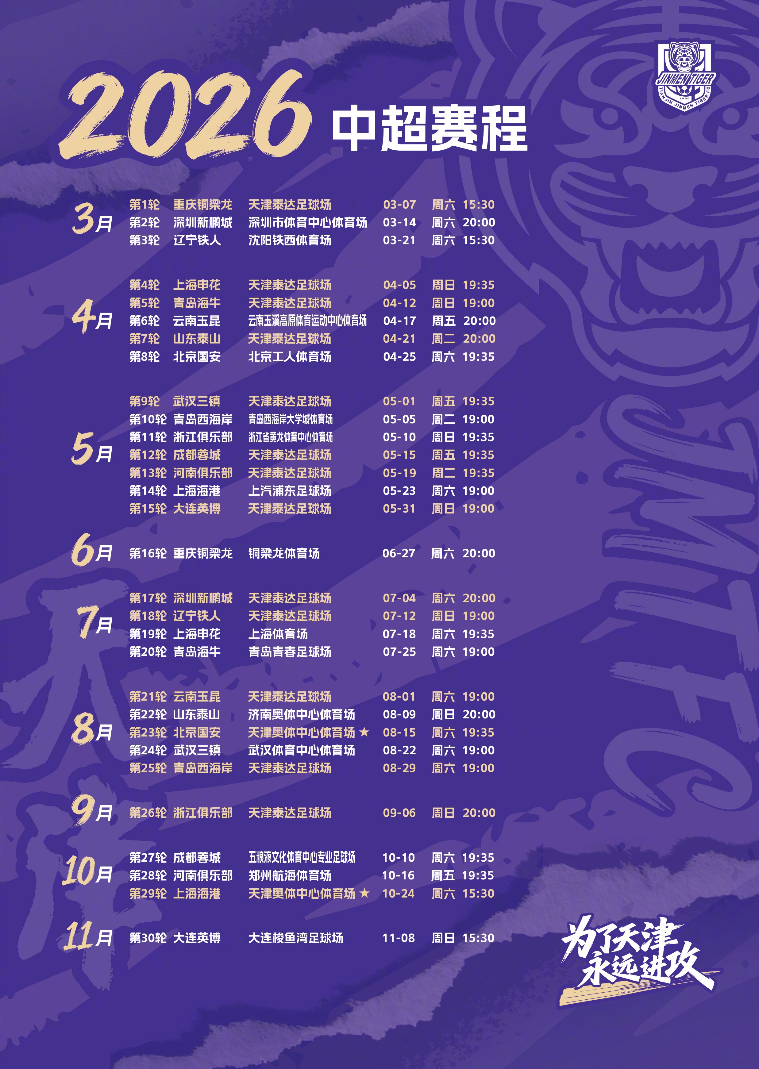 2026赛季中超联赛赛程公布,天津津门虎发布新赛季赛程。津门虎将在3月7日首轮于泰达足球场主场迎战中超新军重庆铜梁龙,8月15日第23轮与北京国安、10月24日第29轮与上海海港的两场比赛将在天津奥体中心体育场进行。 文章导航 巴萨官方:已向西足协发送正式投诉信,谴责其缺乏统一的判罚标准 鲁媒:阿尔瓦罗抵达济南完成体检,15日官宣,球队20日集中
