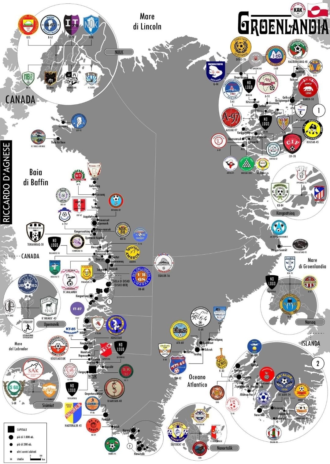 这是一张由海外博主Riccardo D’Agnese绘制的足球俱乐部地理分布图,它的密度并不足以令人震惊。但是你要知道,这是格陵兰岛的足球地图!