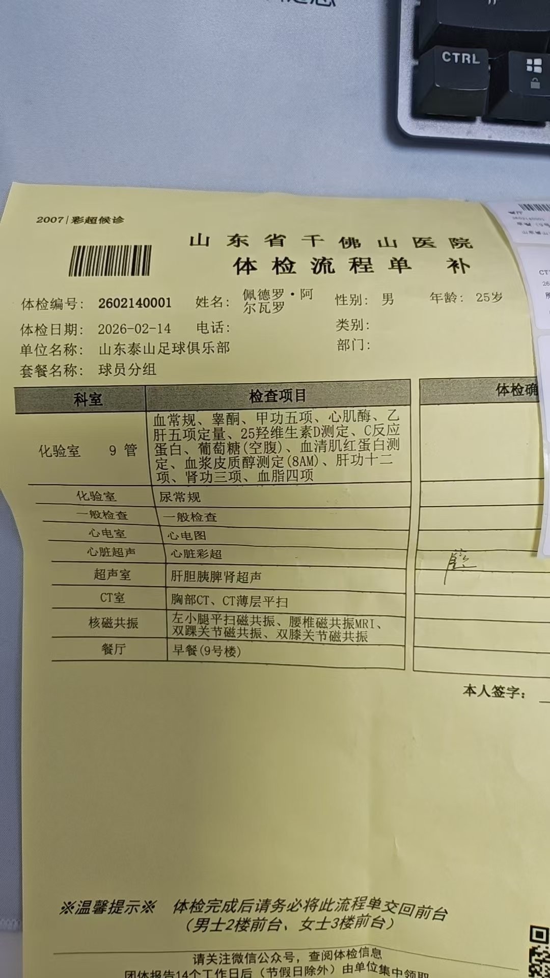 据网传体检报告单显示,佩德罗-阿尔瓦罗进行了尿常规、心电图、心脏彩超、肝胆胰脾肾超声、胸部CT、CT薄层平扫、左小腿平扫核磁共振、腰椎核磁、双踝关节核磁、双膝关节核磁等多项检查。