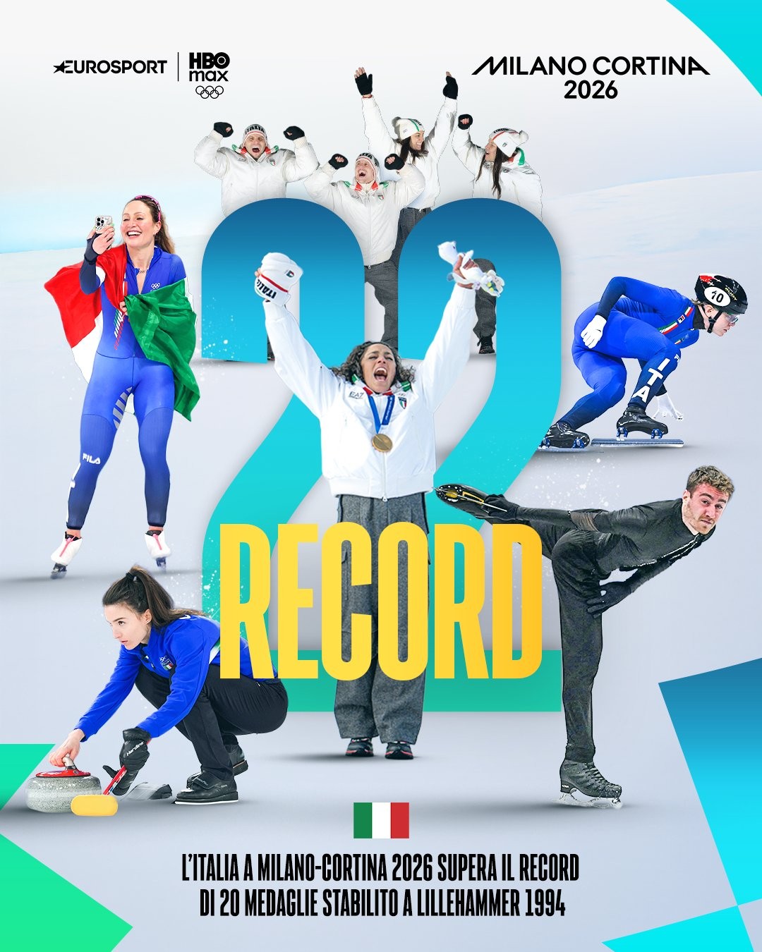 2月15日,意大利代表团在短时间内连夺四枚奖牌——两枚金牌、一枚银牌和一枚铜牌。这使得意大利代表团本届冬奥已拿到8枚金牌,超越了此前利勒哈默尔冬奥会上的7枚,创该国冬奥历史最佳金牌纪录。此外意大利队奖牌总数达到22枚,也刷新了30多年前在1994年利勒哈默尔冬奥会上创下的20枚的历史最佳纪录。