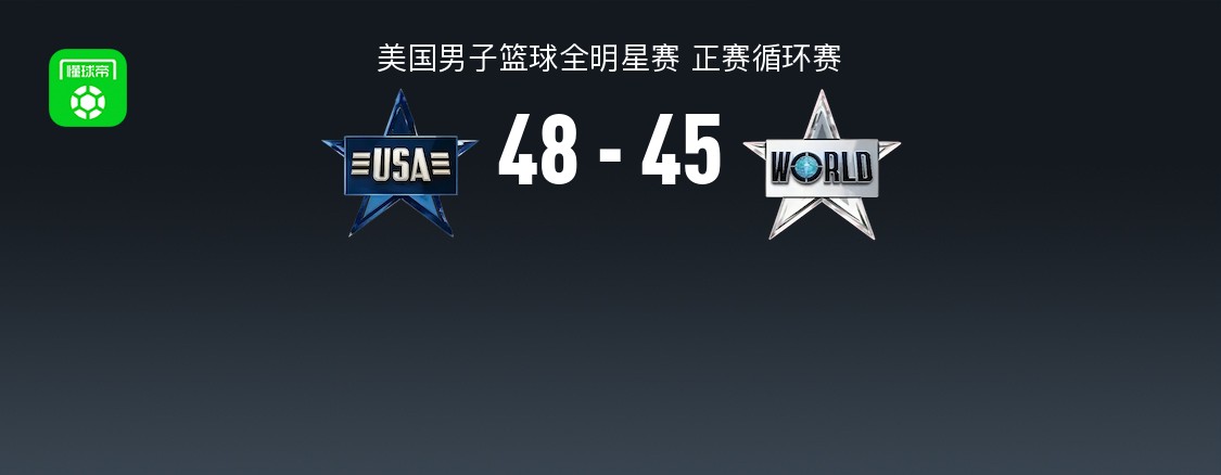 北京时间2月16日美国男子篮球全明星赛 正赛循环赛,美国条纹队对阵世界队。半场美国条纹队0-0世界队,最终美国条纹队48-45世界队。美国条纹队伦纳德31分3板,布伦森8分1板2助;世界队文班亚马19分2板,贾马尔-穆雷8分2板4助。