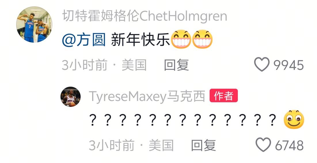 北京时间2月16日,费城76人球星马克西正式开通中文社媒,在评论区出现了一位老熟人切特-霍姆格伦,他直接在评论区圈了方圆并祝她新年快乐。