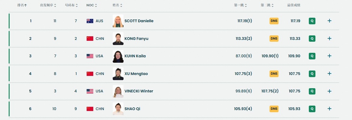2月18日,米兰冬奥会自由式滑雪女子空中技巧决赛首轮结束,中国选手中孔凡钰、徐梦桃和邵琪进入前六,跻身决赛奖牌轮。小将陈梅婷与晋级失之交臂。