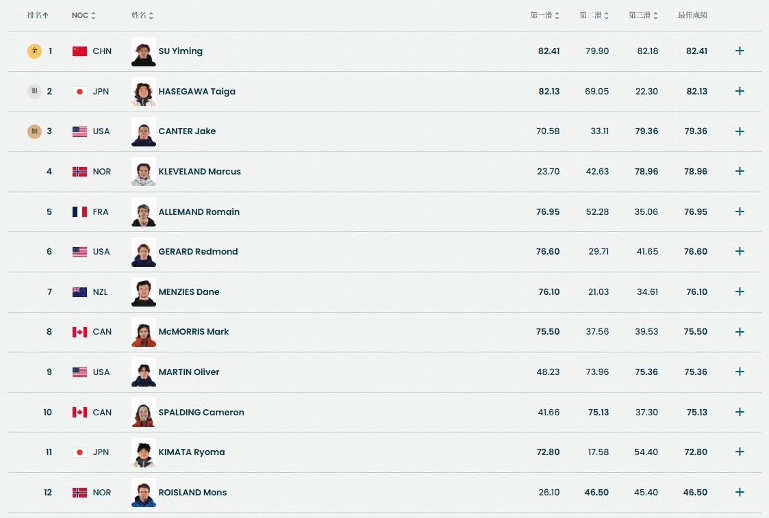 最终,苏翊鸣凭借着第一跳的82.41分,摘得了该项目的金牌!恭喜苏翊鸣!