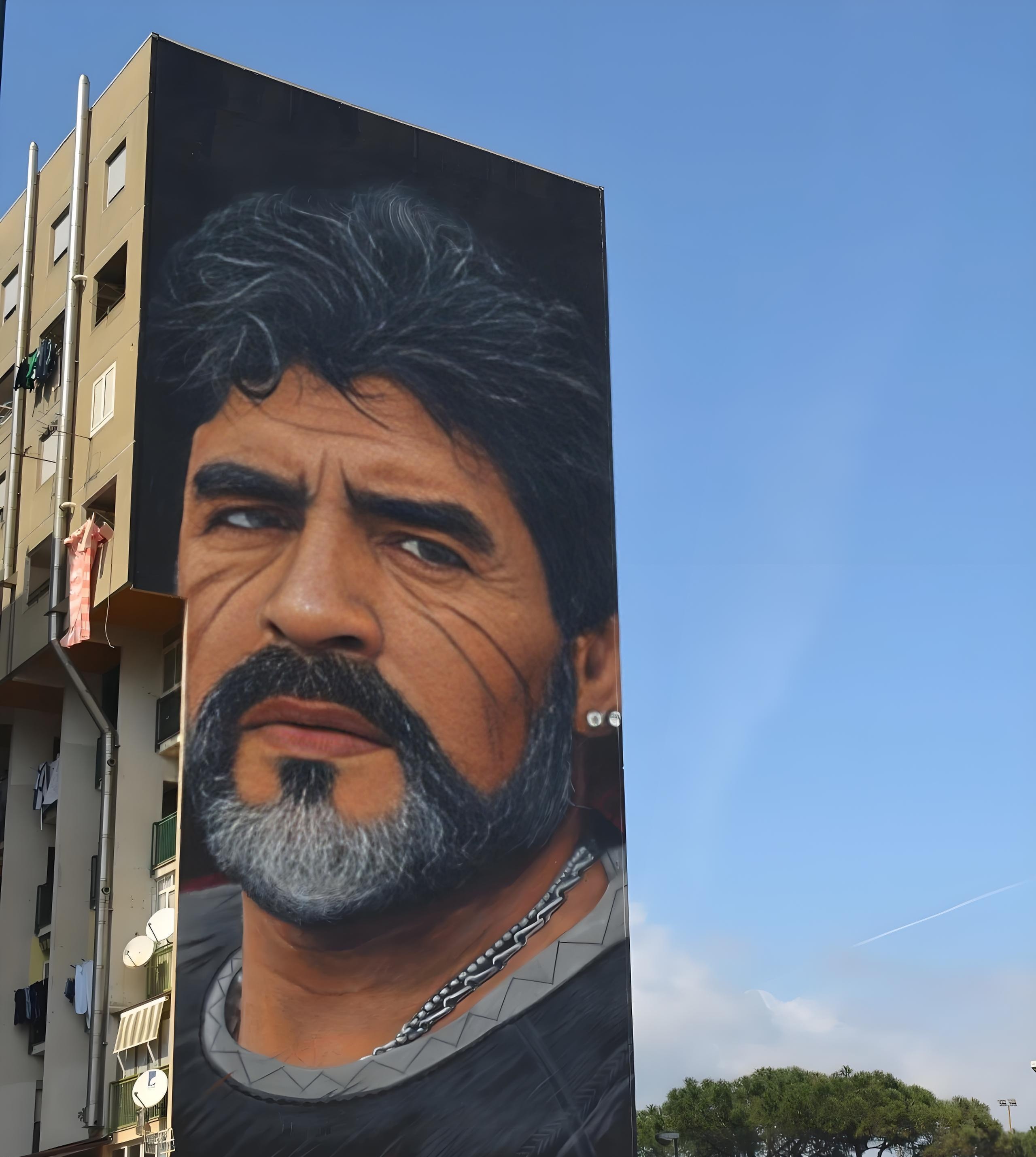 在2017年的那不勒斯街头,著名街头艺术家Jorit创作了一幅马拉多纳的巨型壁画,巨大的马拉多纳肖像俯视着那不勒斯喧嚣的街道,这是Jorit为足球之神绘制的现代图腾。