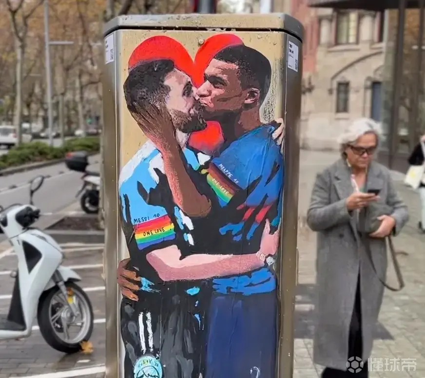 巴塞罗那的街头则以其独特的幽默感著称。在2018年世界杯决赛前,城市艺术家Tvboy创作了一幅梅西和姆巴佩深情拥吻的涂鸦。这不是Tvboy第一次创作这种类型的作品——此前他还创作过穆里尼奥和瓜迪奥拉拥吻的涂鸦,以及梅西踮脚拥吻C罗的作品。