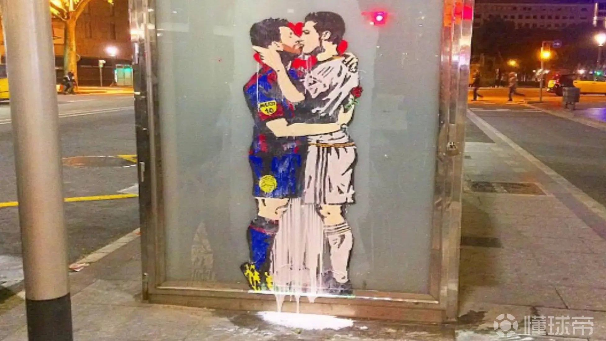 2017年西班牙国家德比前,巴塞罗那街头也出现了由Tvboy创作的梅西踮脚拥吻C罗的涂鸦