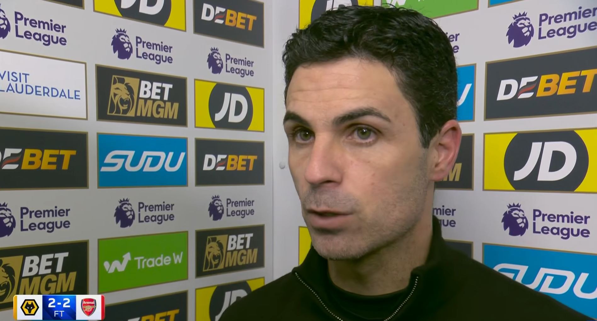 英超联赛第31轮,阿森纳在客场2-2战平狼队。赛后,阿森纳主教练阿尔特塔接受了《当日比赛》节目的采访。