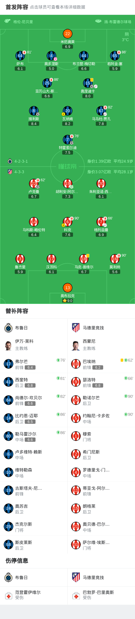 北京时间2月19日欧洲冠军联赛 淘汰赛附加赛首回合,布鲁日对阵马德里竞技。布鲁日奥涅迪卡破门,特雷索尔迪破门,措利斯破门,奥多涅斯自摆乌龙。马德里竞技胡利安-阿尔瓦雷斯破门,卢克曼破门。最终比分布鲁日 33 马竞。