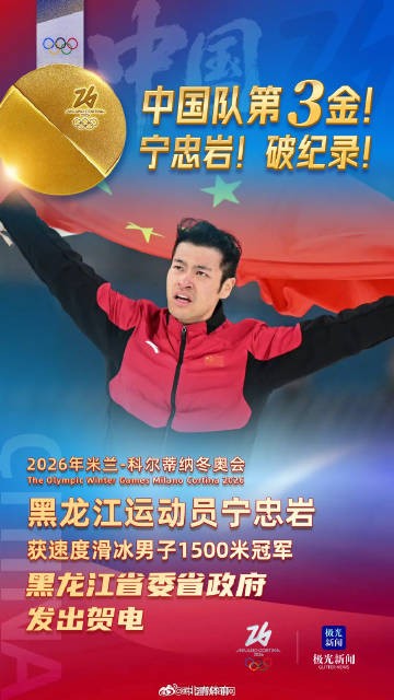 新春佳节之际,欣闻黑龙江运动员宁忠岩在米兰冬奥会速度滑冰男子1500米比赛中力克群雄、勇夺金牌,创造该项目新的奥运纪录,再现“龙江速度”、续写冰雪荣光,向世界展示了龙江儿女为国而战、为国争光的坚定信念和昂扬向上、积极进取的精神风貌,为祖国和人民赢得了荣誉,在新春佳节献上了一份宝贵贺礼!在此,黑龙江省委、黑龙江省人民政府及全省人民,向中国体育代表团、中国速度滑冰队和宁忠岩表示热烈的祝贺和崇高的敬意!衷心感谢国家体育总局对黑龙江体育事业的关心和支持!