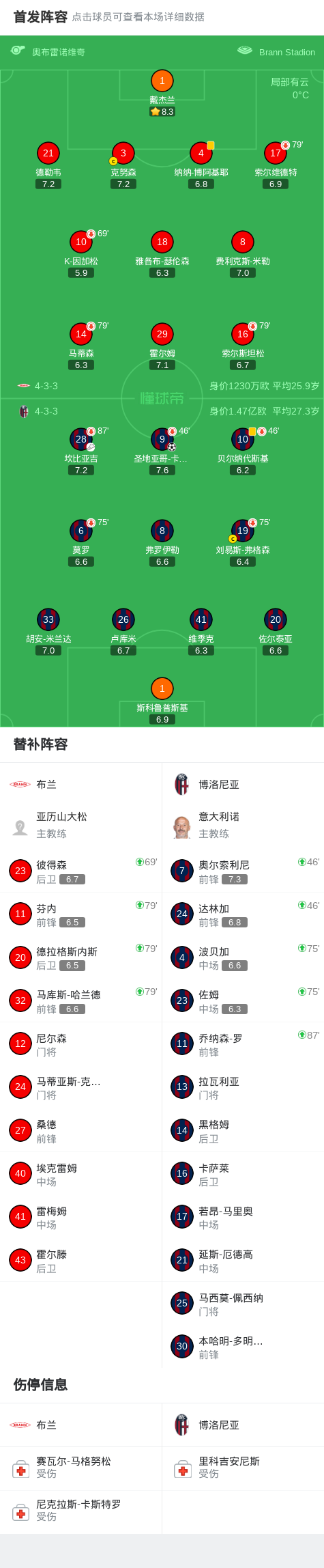 北京时间2月20日欧足联欧洲联赛 淘汰赛附加赛首回合,布兰对阵博洛尼亚。博洛尼亚圣地亚哥-卡斯特罗破门。最终比分布兰 0–1 博洛尼亚。
