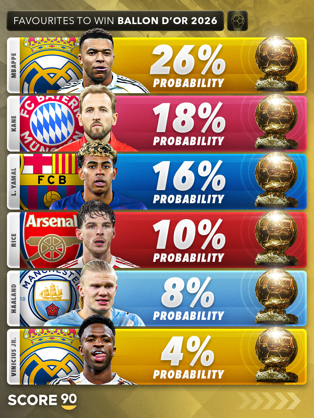 最新金球奖热门排行榜:姆巴佩居首,凯恩次席,亚马尔第三