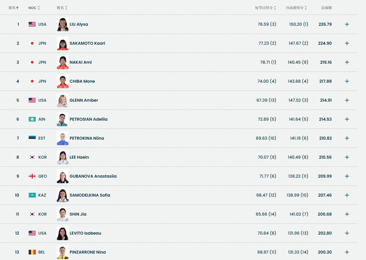 美国选手刘美贤以226.79的总成绩夺得金牌,日本选手坂本花织和中井亚美分别拿到银牌和铜牌。