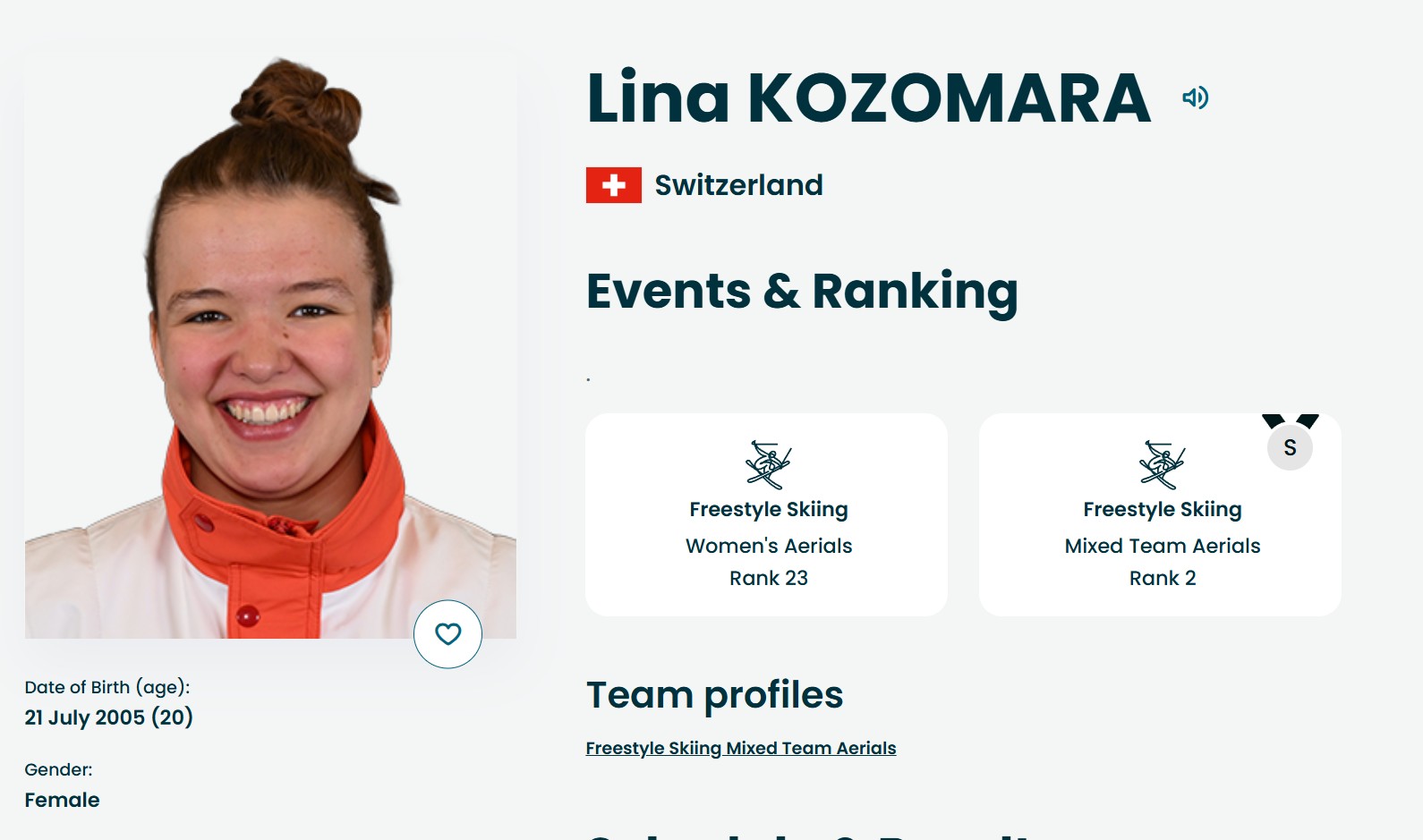 2005年出生的瑞士队女选手莉娜-科佐马拉在自由式滑雪女子空中技巧项目中排名第23。