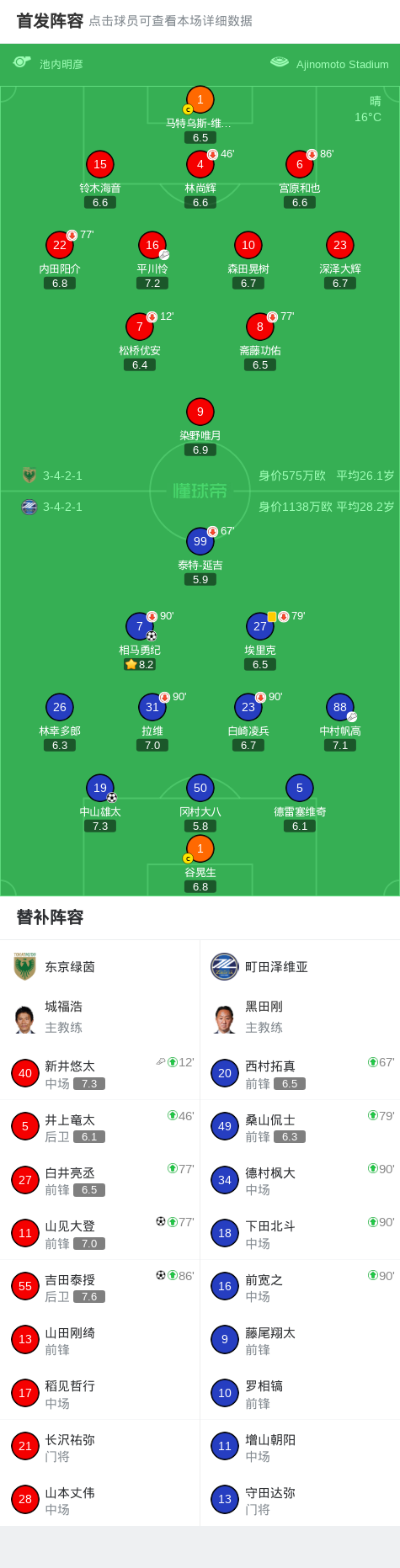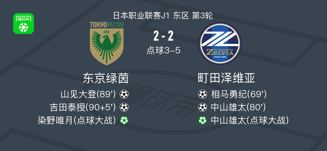 北京时间2月21日日本职业联赛J1 东区 第3轮,东京绿茵主场对阵町田泽维亚。东京绿茵山见大登破门,吉田泰授破门。町田泽维亚相马勇纪破门,中山雄太破门。最终比分东京绿茵 5–7 町田泽维亚。