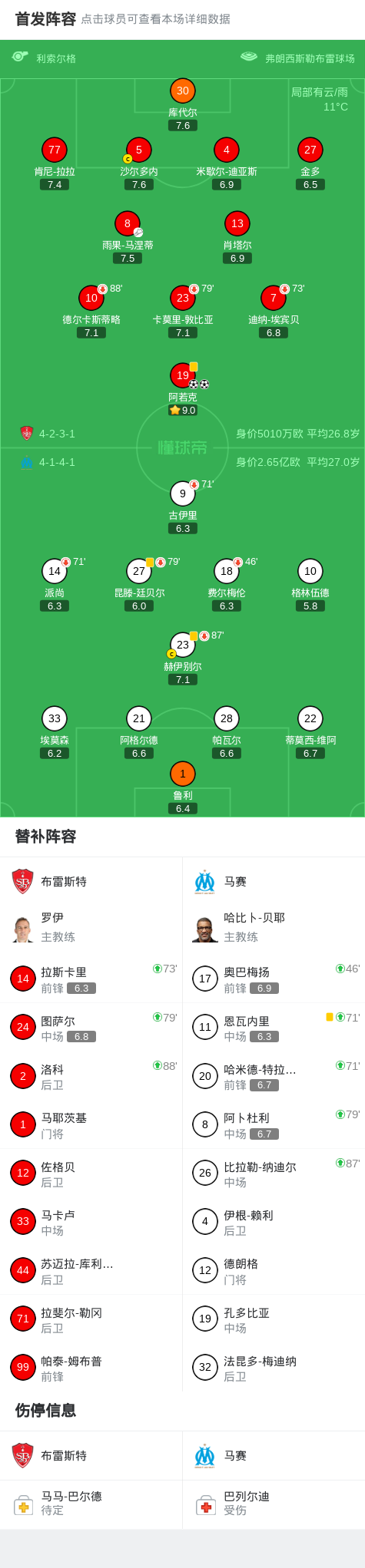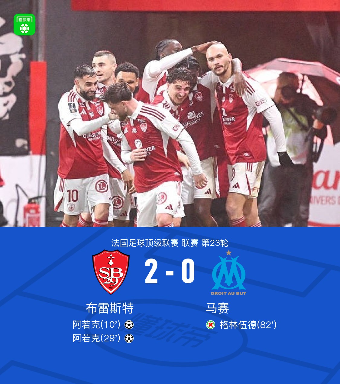 北京时间2月21日法国足球顶级联赛 联赛 第23轮,布雷斯特主场对阵马赛。布雷斯特阿若克梅开二度。最终比分布雷斯特 2–0 马赛。