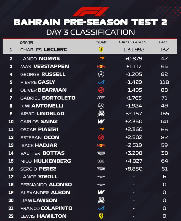 在最快圈方面,勒克莱尔跑出了1分31秒992的成绩,这同时也是今年巴林测试的最快成绩。诺里斯排名第2,维斯塔潘第3。林德布拉德则跑了最多的圈数,他单日跑了足足165圈。