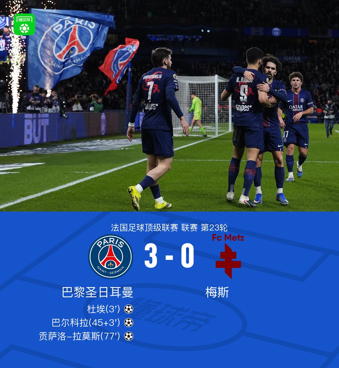 北京时间2月22日法国足球顶级联赛 联赛 第23轮,巴黎圣日耳曼主场对阵梅斯。巴黎圣日耳曼杜埃破门,巴尔科拉破门,贡萨洛-拉莫斯破门。最终比分巴黎圣日耳曼 30 梅斯。