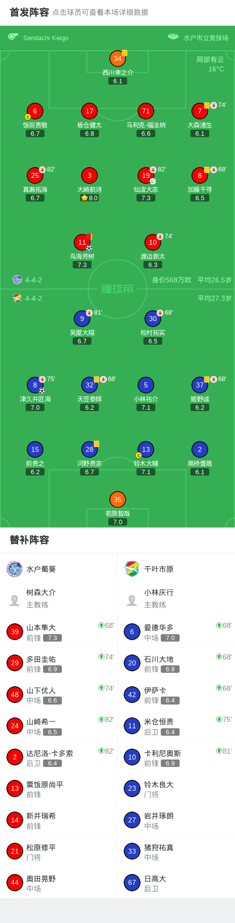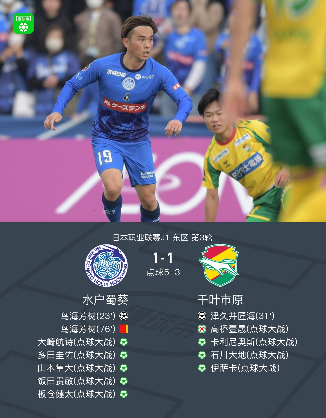 北京时间2月22日日本职业联赛J1东区第3轮,水户蜀葵主场对阵千叶市原。水户蜀葵鸟海芳树破门+染红。千叶市原津久井匠海破门。最终在点球大战中水户蜀葵6–4千叶市原。