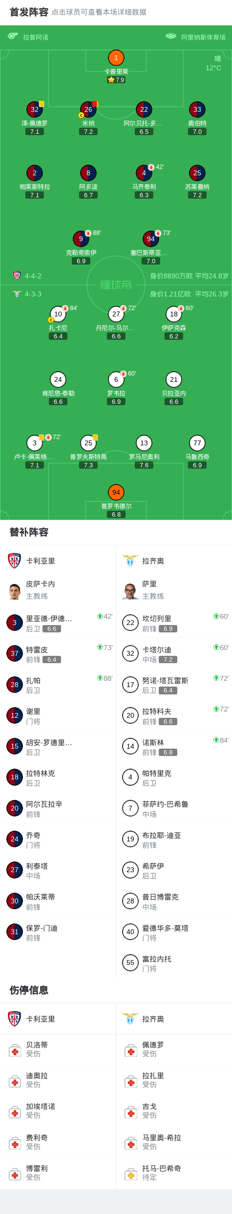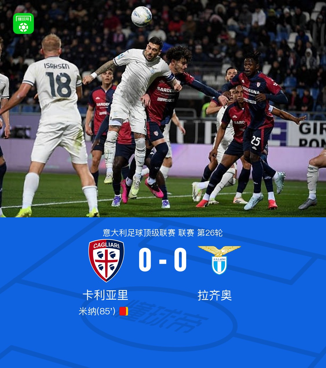 北京时间2月22日意大利足球顶级联赛第26轮,卡利亚里主场对阵拉齐奥。比赛过程中,卡利亚里球员米纳因累计两张黄牌被罚下。最终双方战成0-0平。