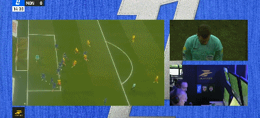 第14分钟,摩纳哥后卫禁区手球,裁判观看VAR后判皮球出界在先没有点球