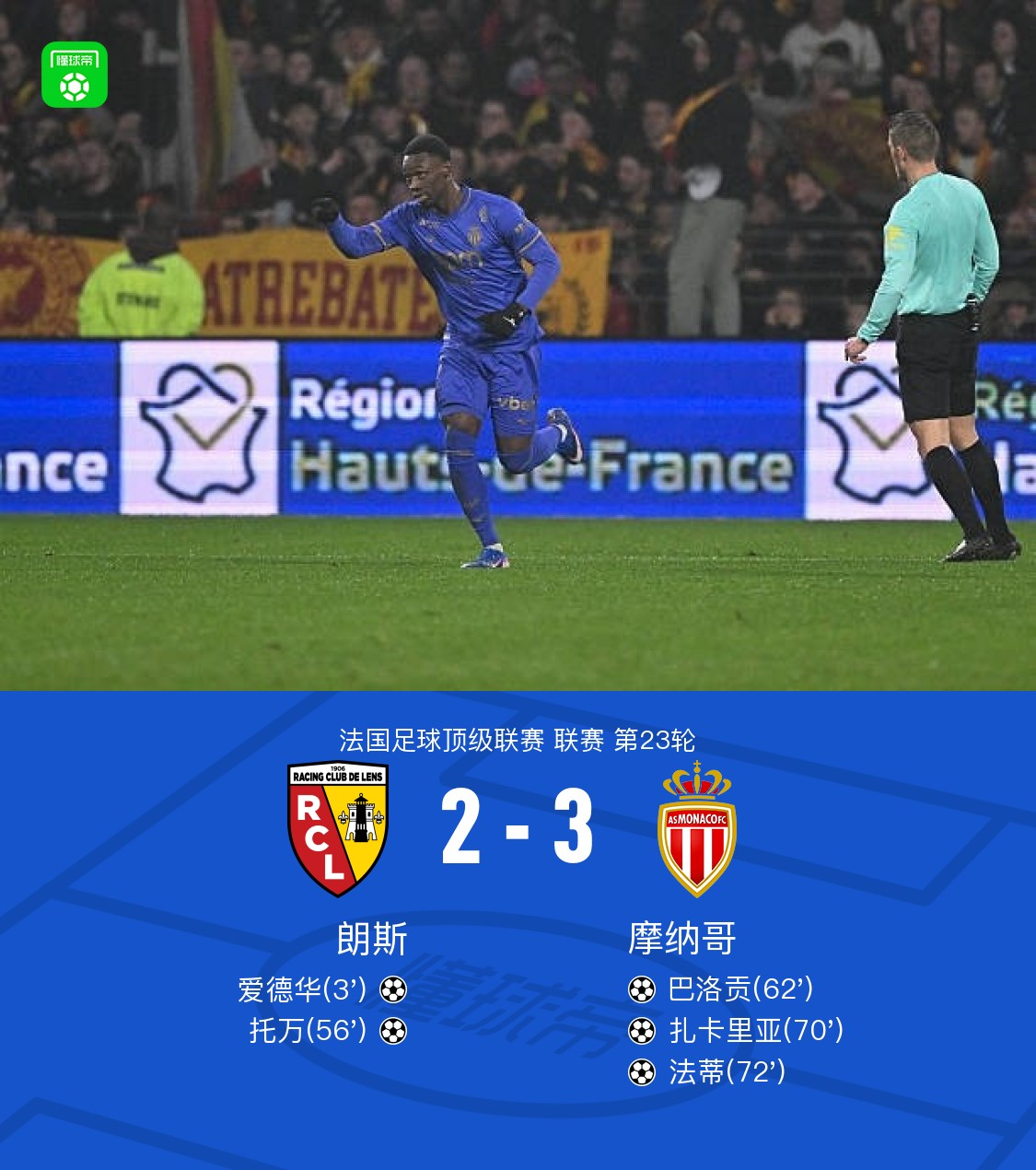 北京时间2月22日法国足球甲级联赛第23轮,朗斯主场迎战摩纳哥。比赛中,朗斯球员爱德华率先破门,随后托万再下一城;摩纳哥则由巴洛贡、扎卡里亚、法蒂接连建功。最终比分定格为朗斯2-3不敌摩纳哥。