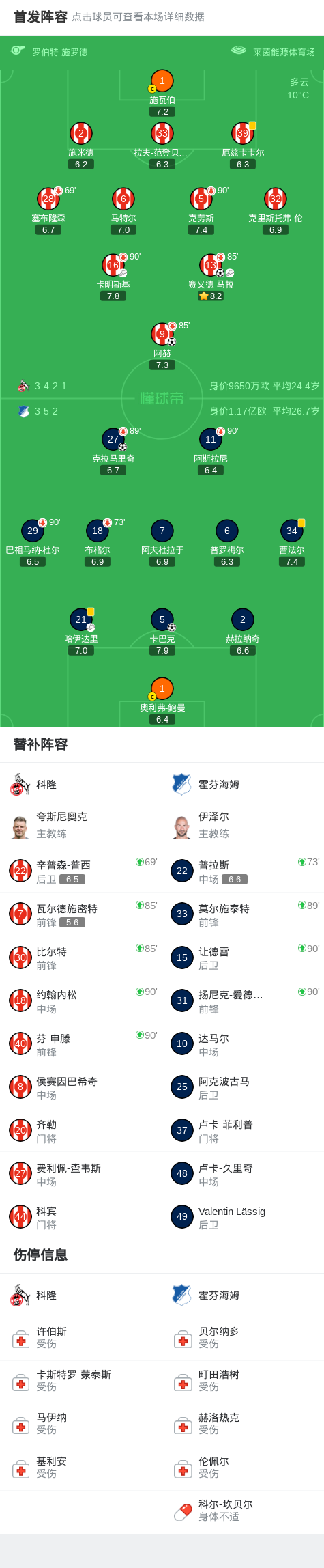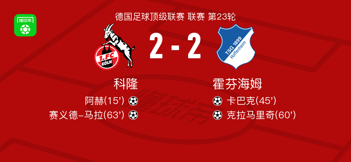 北京时间2月21日德国足球顶级联赛 联赛 第23轮,科隆主场对阵霍芬海姆。科隆阿赫破门,赛义德-马拉破门。霍芬海姆卡巴克破门,克拉马里奇破门。最终比分科隆 2–2 霍芬海姆。