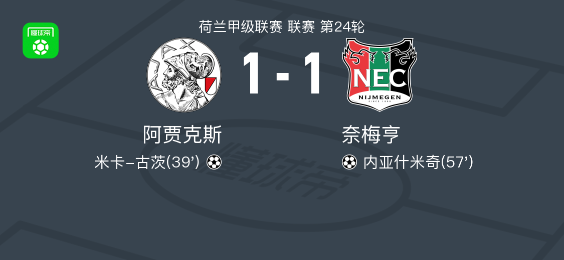北京时间2月22日荷兰甲级联赛 联赛 第24轮,阿贾克斯主场对阵奈梅亨。阿贾克斯米卡-古茨破门。奈梅亨内亚什米奇破门。最终比分阿贾克斯 1–1 奈梅亨。