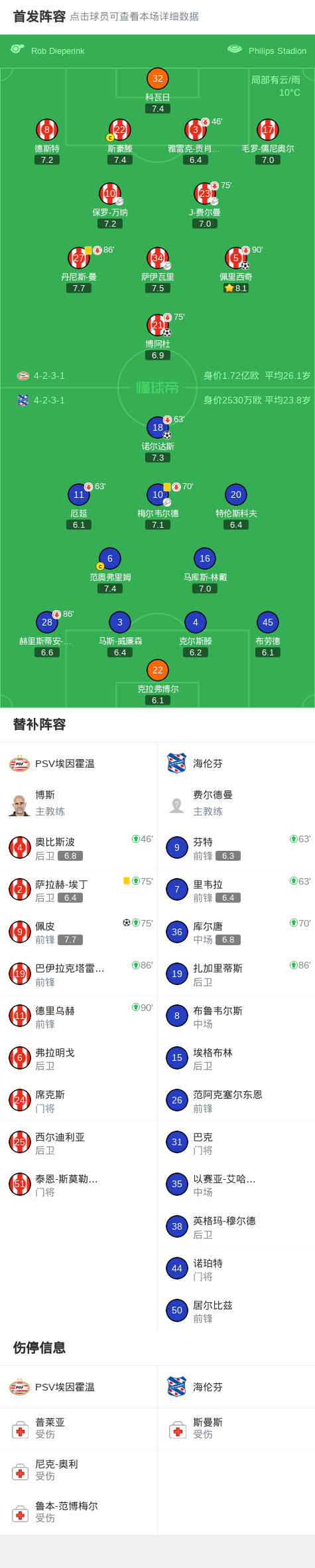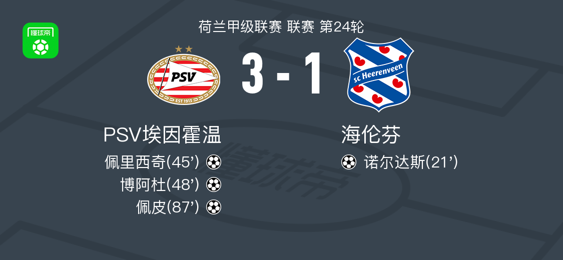 北京时间2月22日荷兰甲级联赛 联赛 第24轮,PSV埃因霍温主场对阵海伦芬。PSV埃因霍温佩里西奇破门,博阿杜破门,佩皮破门。海伦芬诺尔达斯破门。最终比分PSV埃因霍温 3–1 海伦芬。