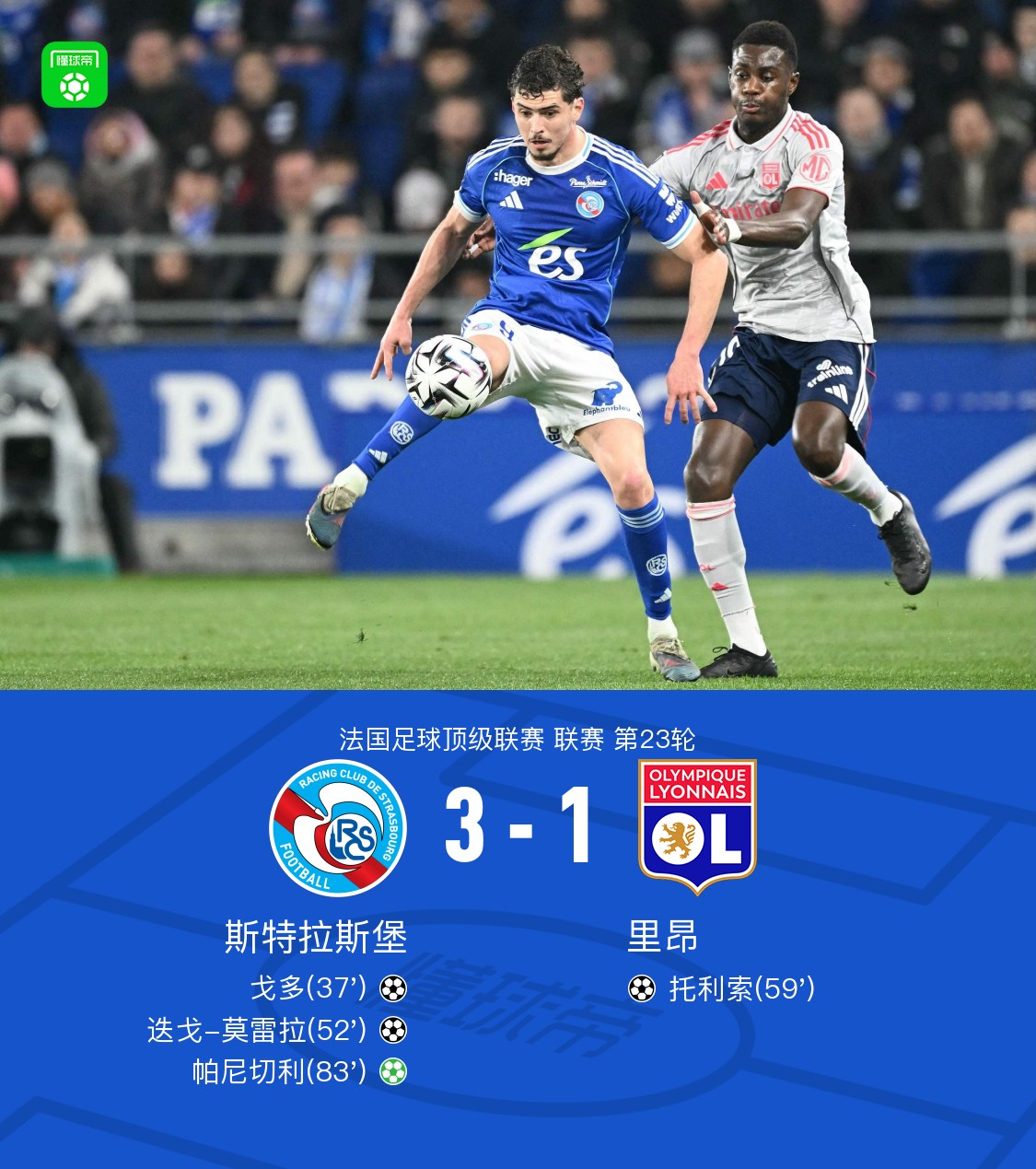 北京时间2月23日法国足球甲级联赛第23轮,斯特拉斯堡主场对阵里昂。比赛中,迭戈-莫雷拉助攻戈多完成破门,随后迭戈-莫雷拉又在队友配合下打入一球,帕尼切利则通过点球机会扩大比分;里昂方面,托利索在队友的助攻下打入一球。最终比分定格为斯特拉斯堡3-1里昂。