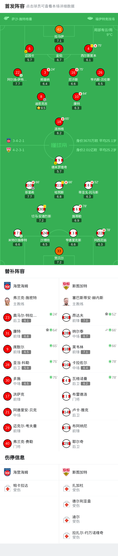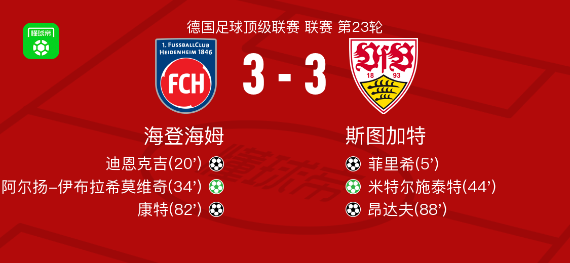 北京时间2月23日德国足球顶级联赛 联赛 第23轮,海登海姆主场对阵斯图加特。海登海姆迪恩克吉破门,康特破门,阿尔扬-伊布拉希莫维奇破门。斯图加特菲里希破门,昂达夫破门,米特尔施泰特破门。最终比分海登海姆 3–3 斯图加特。