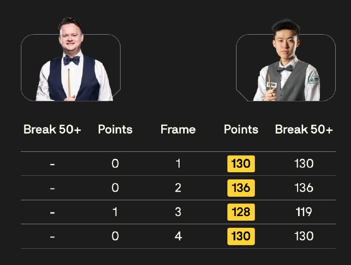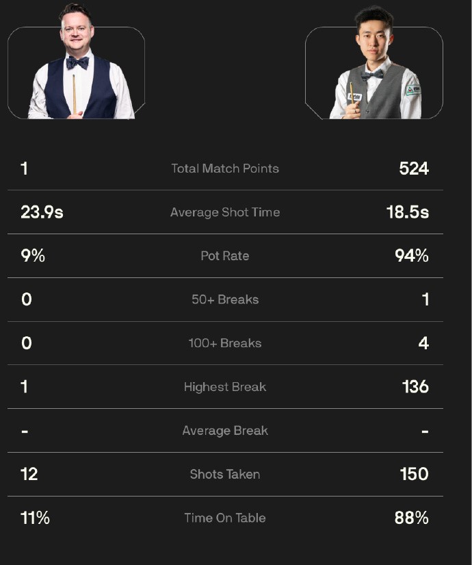 墨菲全场比赛仅在第三局得到1分,而状态神勇的对手狂砍524分,单杆130分、136分、119分、130分的表现令他叹为观止。