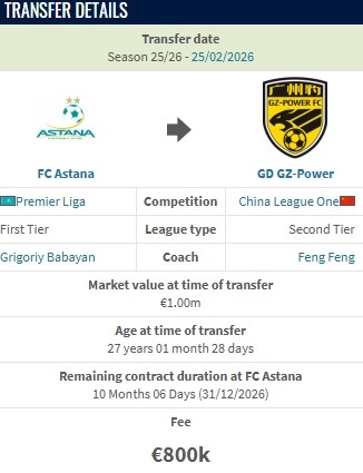 北京时间2月25日,德转更新,阿斯塔纳边锋奥斯曼-卡马拉加盟广东广州豹,转会费80万欧。