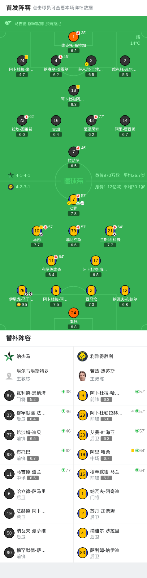 第57分钟,利雅得胜利换人调整,传射建功的C罗被换下