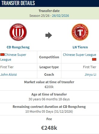 德转显示,元敏诚从成都蓉城加盟辽宁铁人的转会费约200万人民币。