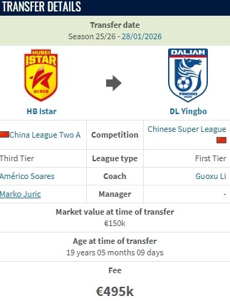 德转显示,孙康博从湖北青年星加盟大连英博的转会费约400万人民币。